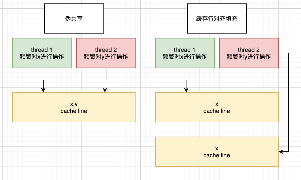 两个变量在同一个缓存行中,但是这是两个不相关的变量。有两个线程分别对齐进行读写,这样就导致缓存频繁的失效,导致效率低下。