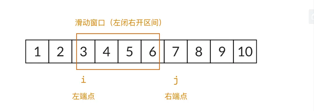 对于这道题来说,数组就是正整数序列 [1,2,3,…,n][1, 2, 3, \dots, n][1,2,3,…,n]。我们设滑动窗口的左边界为 iii,右边界为 jjj,则滑动窗口框起来的是一个左闭右开区间 [i,j)[i, j)[i,j)。注意,为了编程的方便,滑动窗口一般表示成一个左闭右开区间。在一开始,i=1,j=1i=1, j=1i=1,j=1,滑动窗口位于序列的最左侧,窗口大小为零。