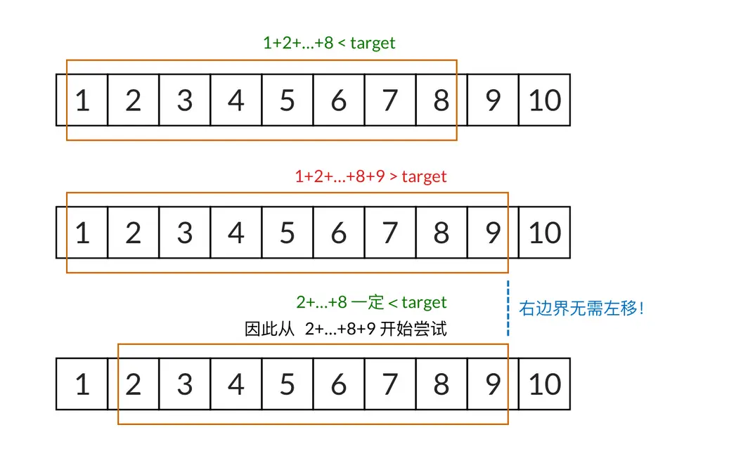 我们一开始要找的是 1 开头的序列,只要窗口的和小于 target,窗口的右边界会一直向右移动。假设 1+2+⋯+81+2+\dots+81+2+⋯+8 小于 target,再加上一个 9 之后, 发现 1+2+⋯+8+91+2+\dots+8+91+2+⋯+8+9 又大于 target 了。这说明 1 开头的序列找不到解。此时滑动窗口的最右元素是 9。
