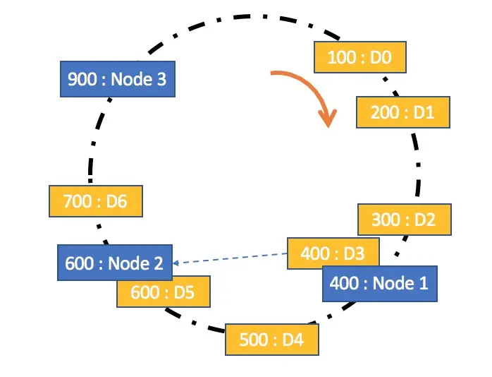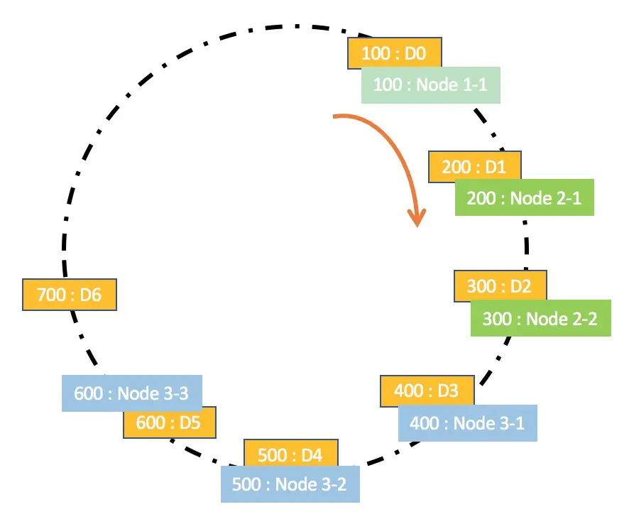 那么,按照带虚拟节点的哈希一致性方法, 数据 D0 和 D6 按顺时针方向的下一个虚拟存储节点为 Node 1-1,因此节点 Node1 将会存储数据 D0(id = 100)和 D6(id = 700);同理,Node2 将会存储数据 D1(id = 200)和 D2(id = 300),Node3 将会存储数据 D3(id = 400)、D4(id = 500)和 D5(id = 600)。