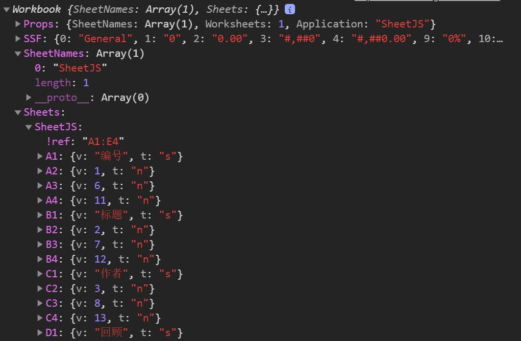 sheet[!merges]:存放一些单元格合并信息,是一个数组,每个数组由包含s和e构成的对象组成,s表示开始,e表示结束,r表示行,c表示列;如: