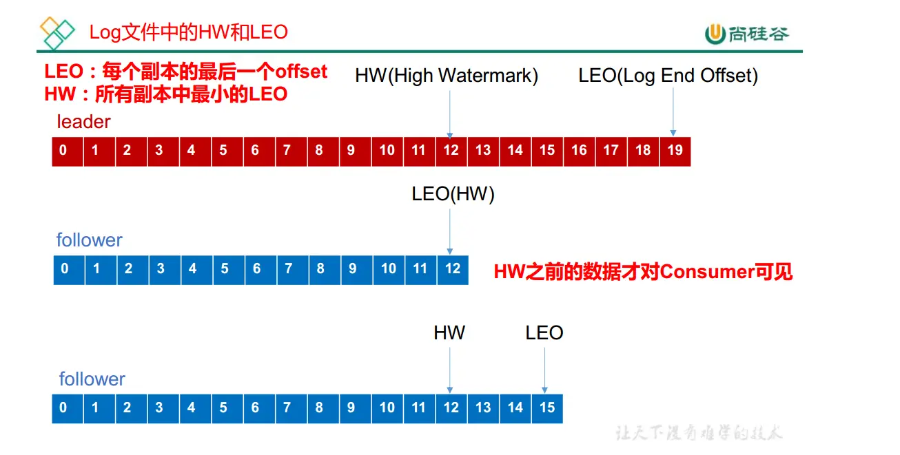 HW:指的是消费者能见到的最大的 offset,ISR 队列中最小的 LEO。