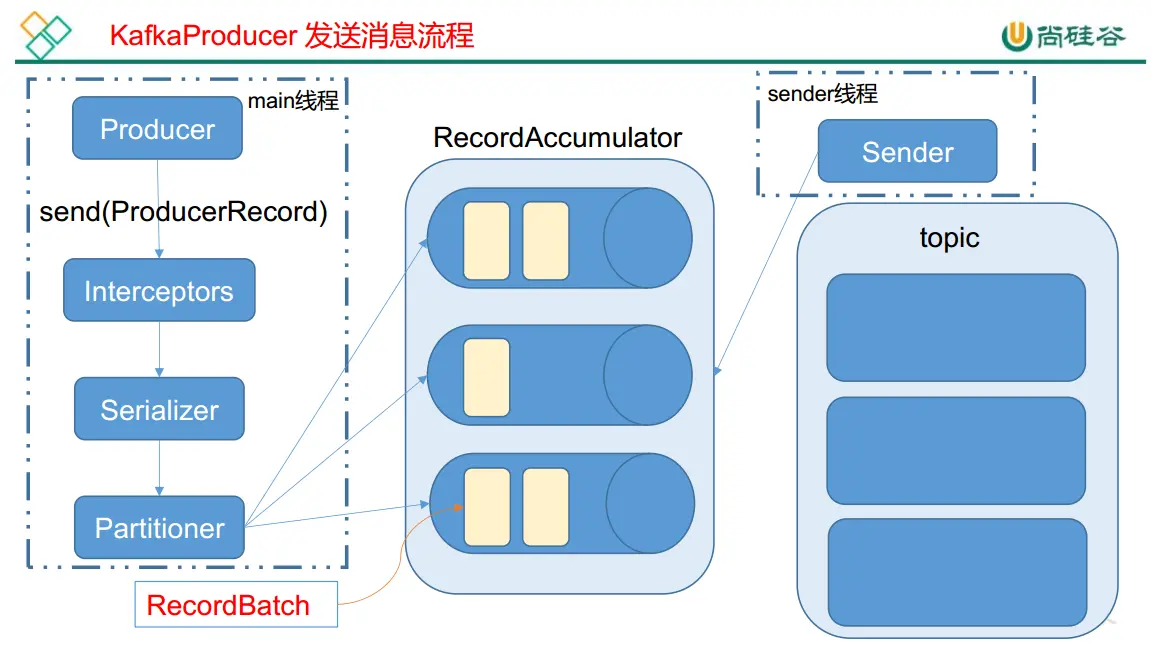 Kafka 的 Producer 发送消息采用的是异步发送的方式。在消息发送的过程中,涉及到了两个线程——main 线程和 Sender 线程,以及一个线程共享变量RecordAccumulator。main 线程将消息发送给 RecordAccumulator,Sender 线程不断从 RecordAccumulator 中拉取消息发送到 Kafka broker。