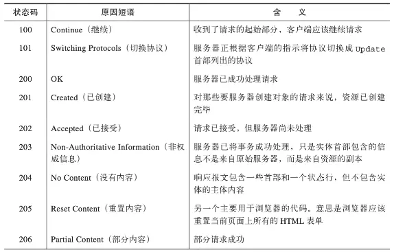 而伴随每个状态码,HTTP还会发送一条解释性的原因短语。整个的状态码如下图所示。