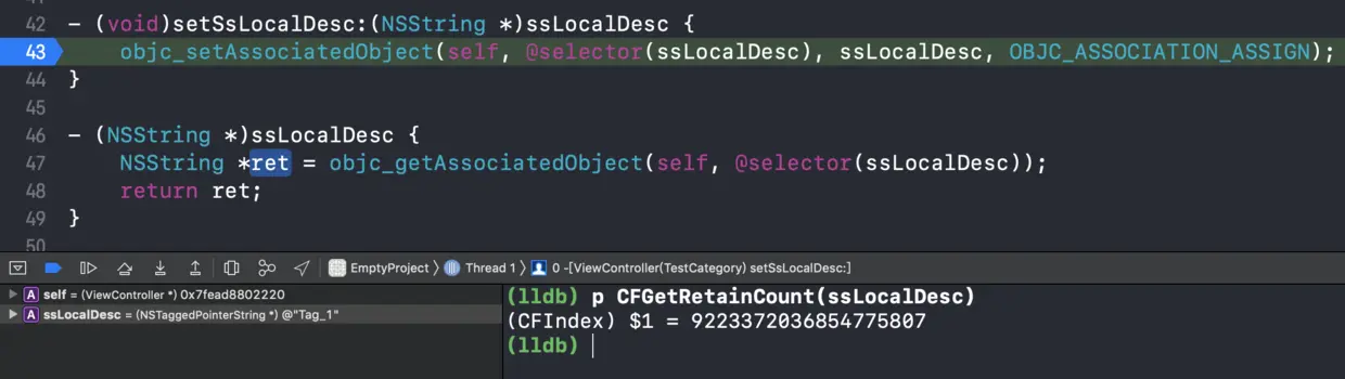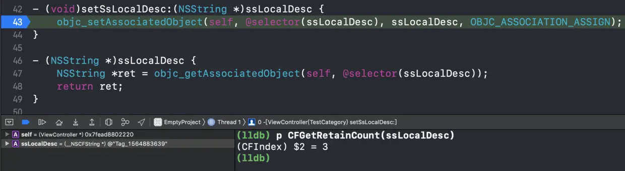 ssLocalDesc属性是字符串,字符串通常使用strong或者copy,那么这里使用OBJC_ASSOCIATION_ASSIGN本身就是错误的。 OBJC_ASSOCIATION_ASSIGN通常是为了避免循环引用而添加,不会对引用计数产生变化。