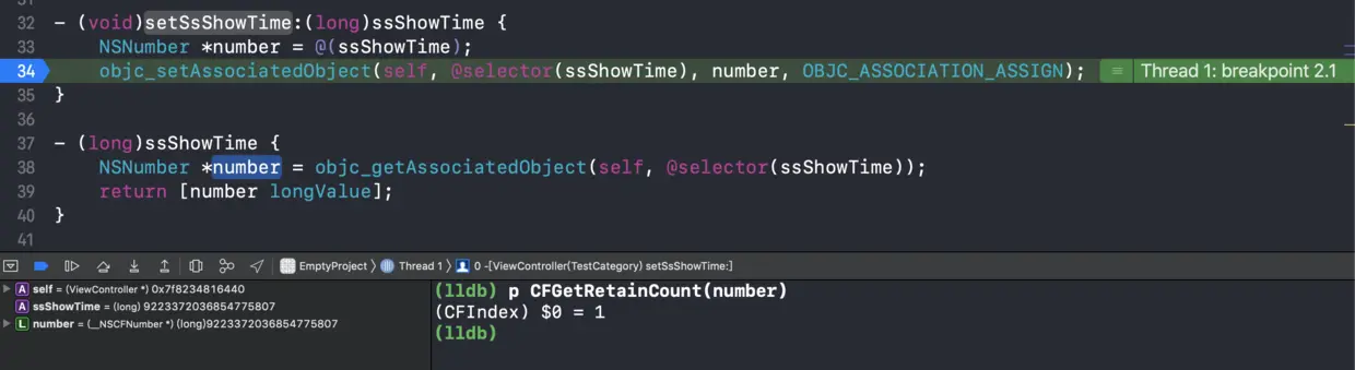 当解决完这个问题之后,我们发现crash出现之前,有几个延伸问题: 问题1:为什么ssShowTime这个属性在运行过程中不会Crash? 我们知道Crash是由于OBJC_ASSOCIATION_ASSIGN不会引用计数加1,导致对象被释放出现野指针的情况。那么我们在number对象挂载之前,看下对象的引用计数。