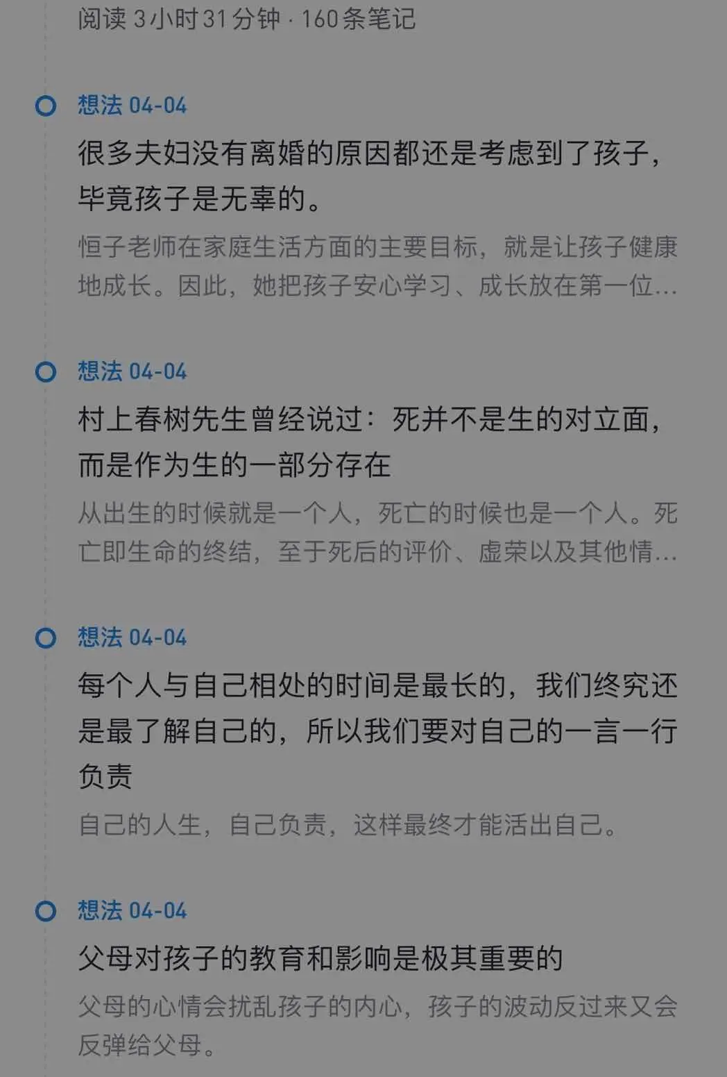 以前自己在看纸质书的时候,很少做笔记。边看书边做笔记的习惯,是在疫情期间坚持使用养成的。同时还能看其他读者朋友的笔记,大家一起交流讨论,思想上发生了碰撞。曾经看的《人间值得》部分笔记。