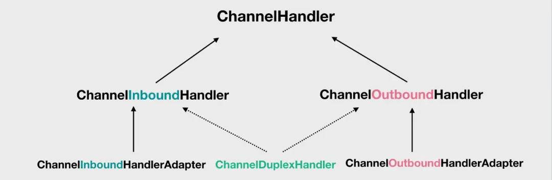 定义处理 Inbound 事件的 handler 需要实现 ChannelInboundHandler,定义处理 Outbound 事件的 handler 需要实现 ChannelOutboundHandler。最下面的三个类,是 Netty 提供的适配器,特别的,如果我们希望定义一个 handler 能同时处理 Inbound 和 Outbound 事件,可以通过继承中间的 ChannelDuplexHandler 的方式,比如 LoggingHandler 这种既可以用来处理 Inbound 也可以用来处理 Outbound 事件的 handler。