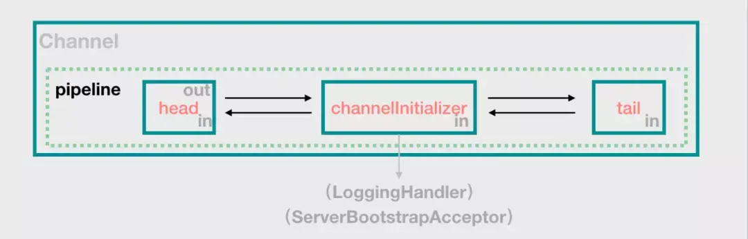 大家可以稍微看一下 ChannelInitializer 的 initChannel 方法,有个简单的认识就好,此时的 pipeline 应该是这样的: