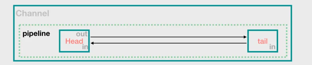 并且最后两行代码将 tail 和 head 连接起来:注意,在不同的版本中,源码也略有差异,head 不一定是 in + out,大家知道这点就好了。还有,从上面的 head 和 tail 我们也可以看到,其实 pipeline 中的每个元素是 ChannelHandlerContext 的实例,而不是 ChannelHandler 的实例,context 包装了一下 handler,但是,后面我们都会用 handler 来描述一个 pipeline 上的节点,而不是使用 context,希望读者知道这一点。