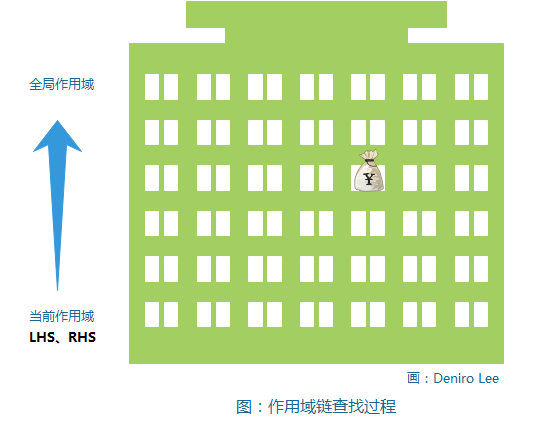 我们可以把作用域链想象成一栋大楼,第一层表示当前执行作用域,第二层表示嵌套在外层的作用域,以此类推。大楼的顶层表示全局作用域 。LHS 和 RHS 都会先在当前楼层进行查找,如果没有找到,会前往上一层,如果还是没有找到就继续向上,以此类推。此过程会一直持续到顶层,即全局作用域。
