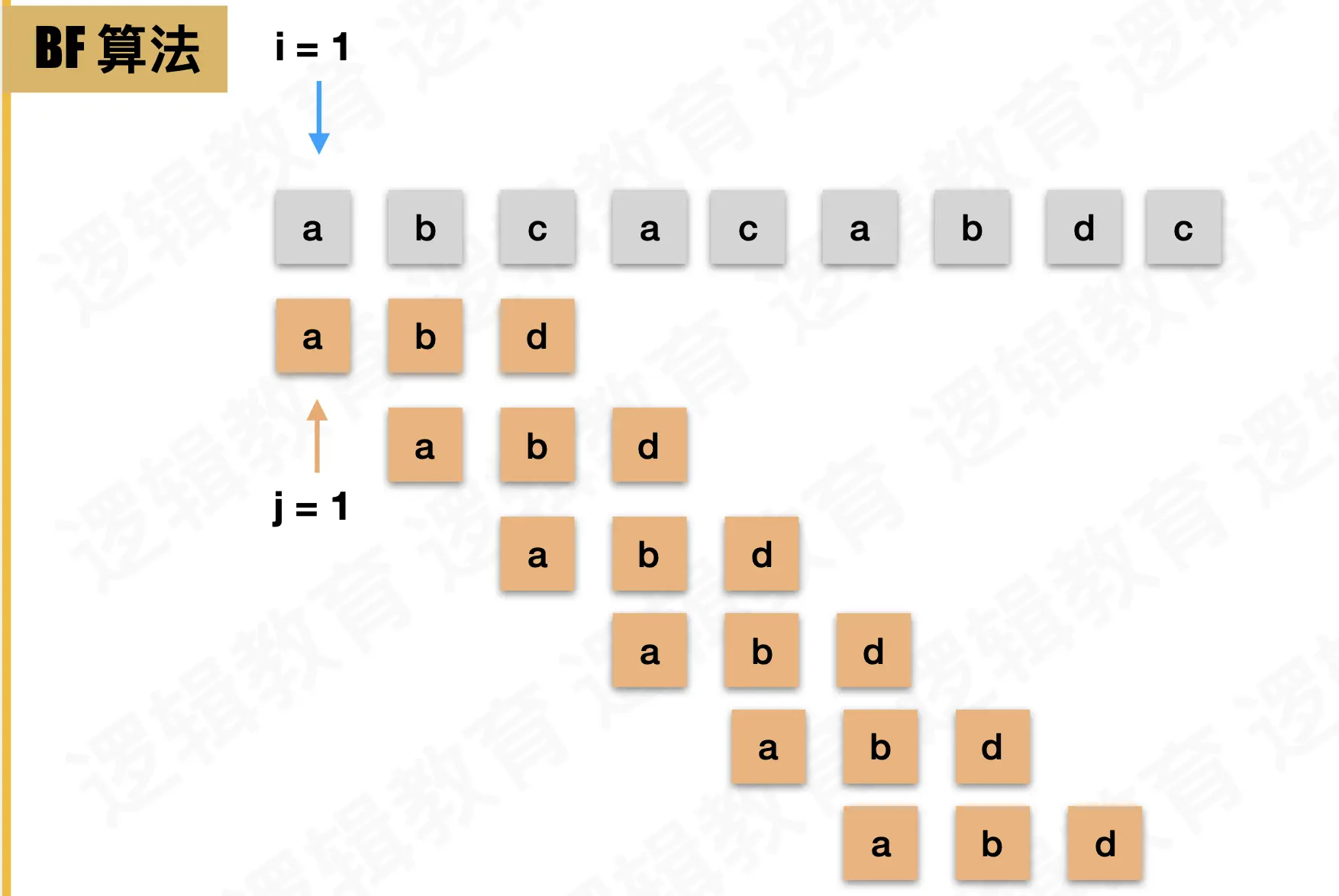 * 若不相等,指针后退重新开始匹配. 从主串的下一个字符串(i = i - j + 2)起再重新和模式第一个字符(j = 1)比较;