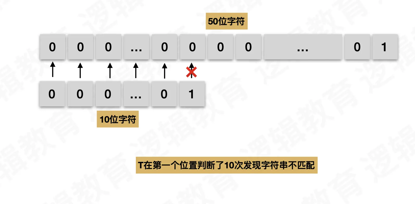 BF实现字符串匹配的弊端: 假设子串的长度为n,如果子串的的n-1的字符都匹配上了,而第n个字符没有匹配,BF算法又会从i=0的位置开始比较。直到匹配上或者匹配不上,所以针对这种极端的情况下,BF实现字符串匹配是非常耗时。