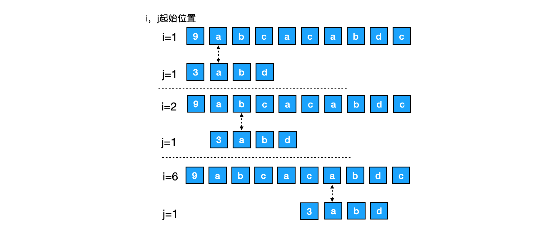 //不相等时,j的的位置要从头开始进行匹配,i应当退回到当次匹配的首位的下一位