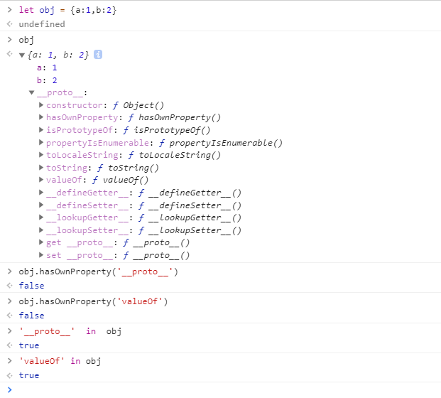 2. in 用于判断对象“自身”及其“继承对象”是否具有某个属性: