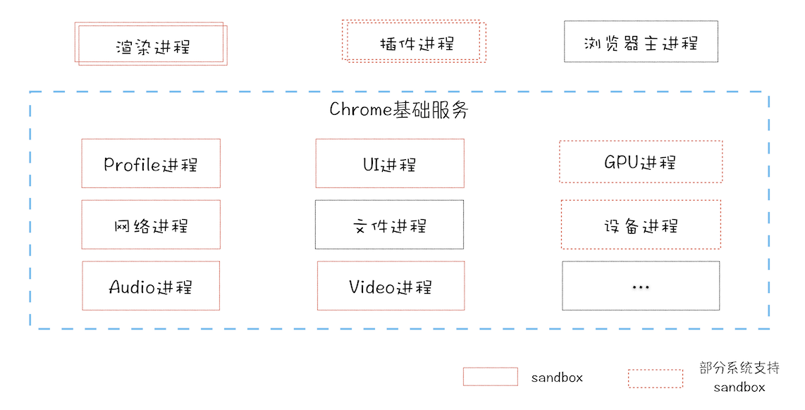 - 早期的浏览器是单进程架构的,不安全,不稳定,不流畅。之后就演变成为了多进程,现在的多进程已经非常丰富了,下图就是目前的多进程架构。(文章全部基于Chrome)