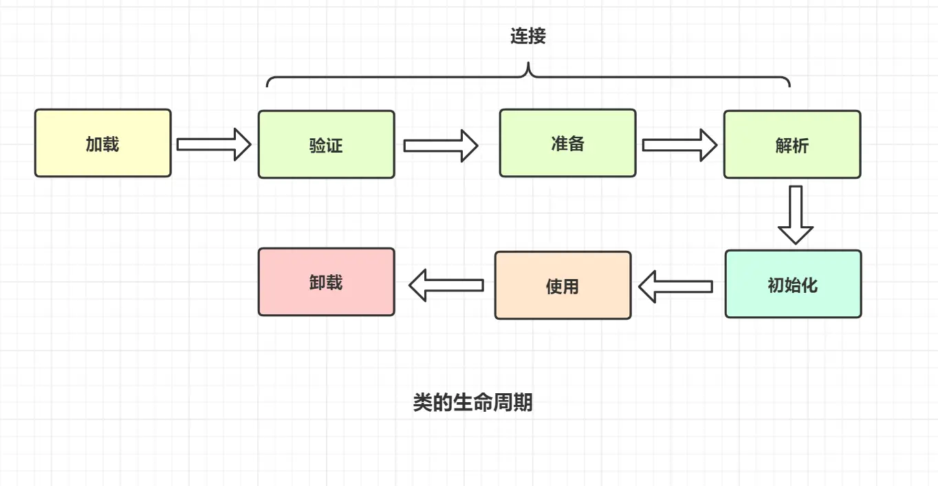一个类从被加载到虚拟机内存开始,到卸载出内存为止,这个生命周期经历了七个阶段:加载、验证、准备、解析、初始化、使用、卸载。