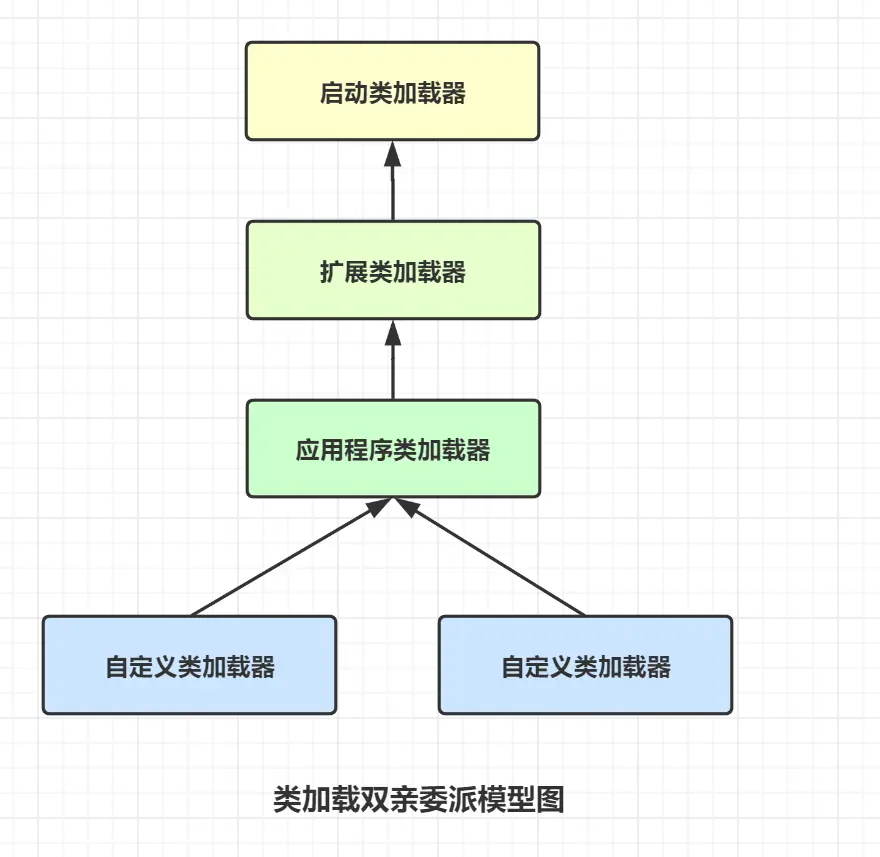 如果一个类加载器收到类加载的请求,它首先不会自己去尝试加载这个类,而是把这个请求委派给父类加载器完成。每个类加载器都是如此,只有当父加载器在自己的搜索范围内找不到指定的类时(即ClassNotFoundException),子加载器才会尝试自己去加载。