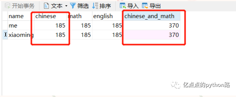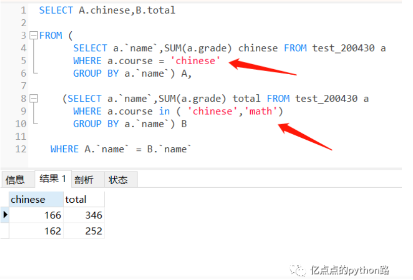 刚开始我用了**两个子查询**,一个子查询计算语文和数学的总分,另一个子查询计算语文的总分,再把两个结果集通过 name 链接起来。