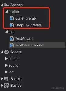 打开场景列表,我们能看到除了场景文件*.scene、动画文件*.ani外,列表中还多了一组prefab文件夹,其中包括了Bullet.prefab和DropBox.prefab。