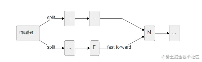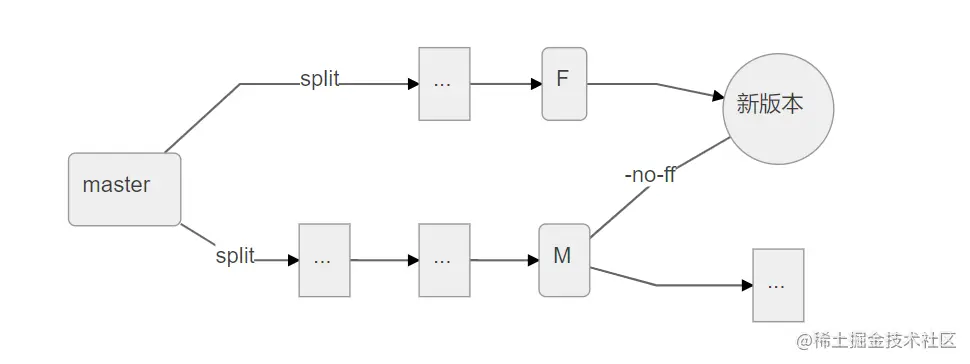 另一种情况是F和M形成了分裂(M不能包含F,因为修改了不同文件或者修改了相同的文件且造成冲突),在解决了所有可能发生的冲突后,git合并F和M的修改,创建一个全新版本(图2)。值得注意的是,如果在merge操作时带上-no-ff参数,则会强制按照这种方式合产生新版本。