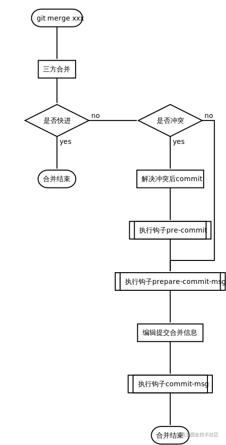 在merge过程中会依次触发prepare-commit-msg和commit-msg钩子;如果有冲突,则在此之前,解决冲突并commit后触发pre-commit钩子,具体流程见下图。
