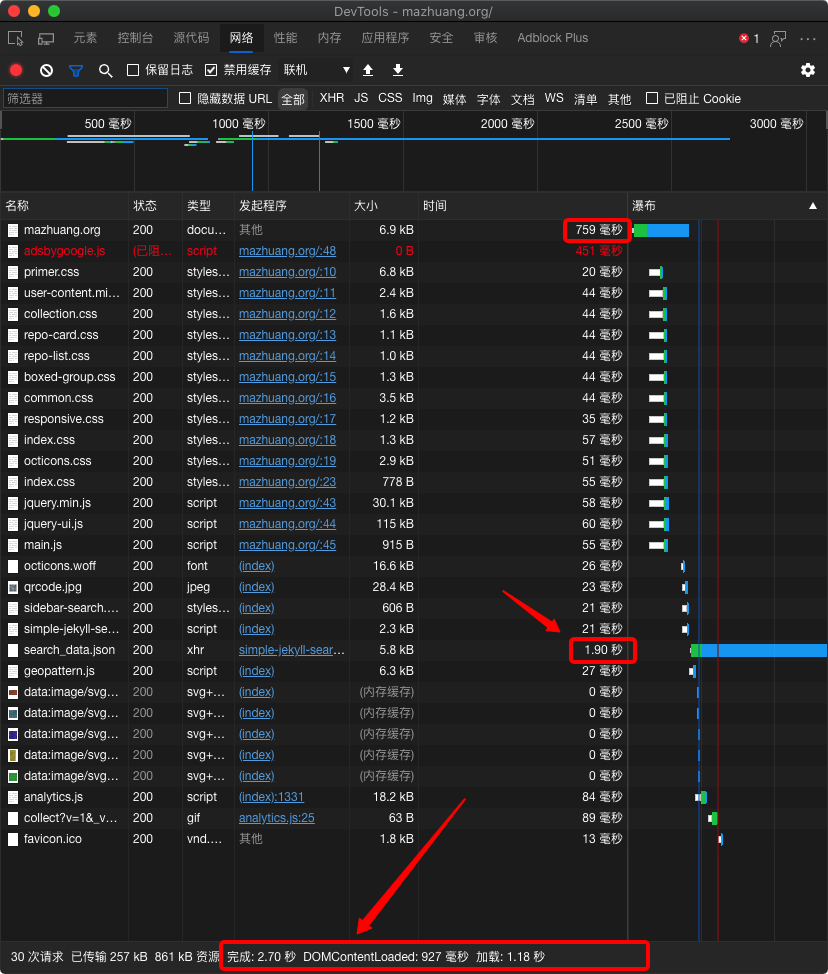 可以看到耗时最长的两个请求时间达到了 12 秒左右,而且很多资源的加载时间在 1 秒以上,页面完成加载时间长达 15 秒多……估计一般的访客是没这个耐心等待的。