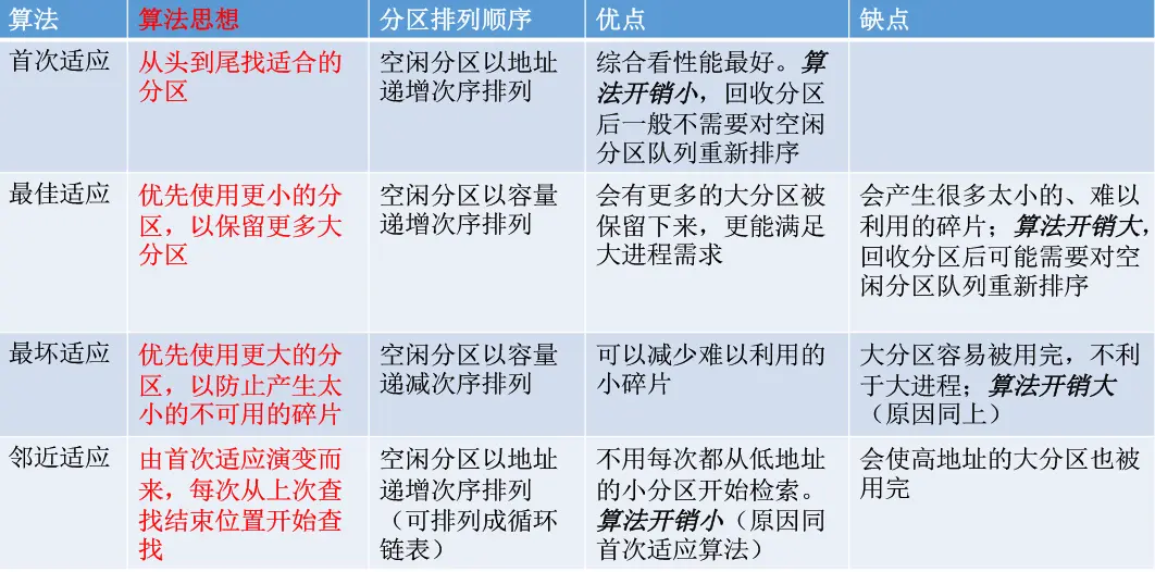 - 由于地址一开始就是确定下来的,始终能够保证顺序是递增的,因此这种算法无需频繁地变更空闲分区的顺序,而且每次优先利用低地址空间,保证了高地址空间有足够大的空闲区域可供大进程使用。