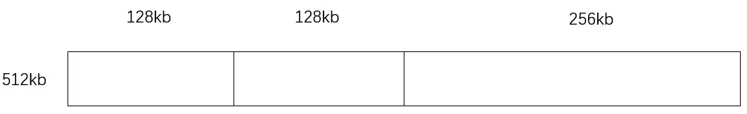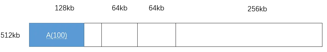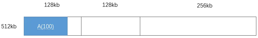 进程 A 请求 100kb,因为 64<100<128,即 2^6^<100<2^7^,所以寻找是否有 2^7^=128 的空闲分区,当然是没有的(目前只有 512kb),所以寻找是否有 2^8^=256 的空闲分区,也没有,所以寻找是否有 2^9^=512 的空闲分区,找到了,此时就把 512kb 一分为二: