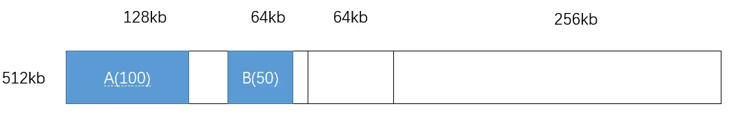 进程 B 请求 50kb,因为 32<50<64,即 2^5^<100<2^6^,所以寻找是否有 2^6^=64 的空闲分区,当然是没有的,所以寻找是否有 2^7^=128,找到了,此时就把 128kb 一分为二: