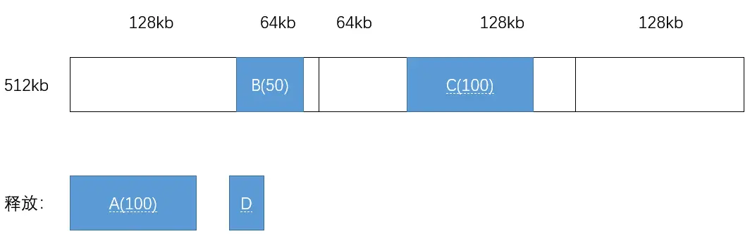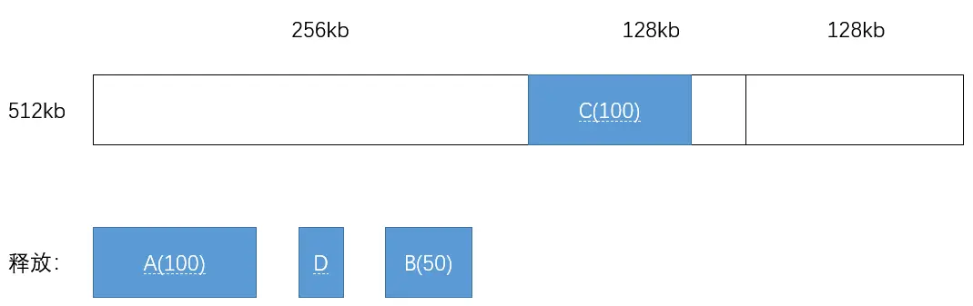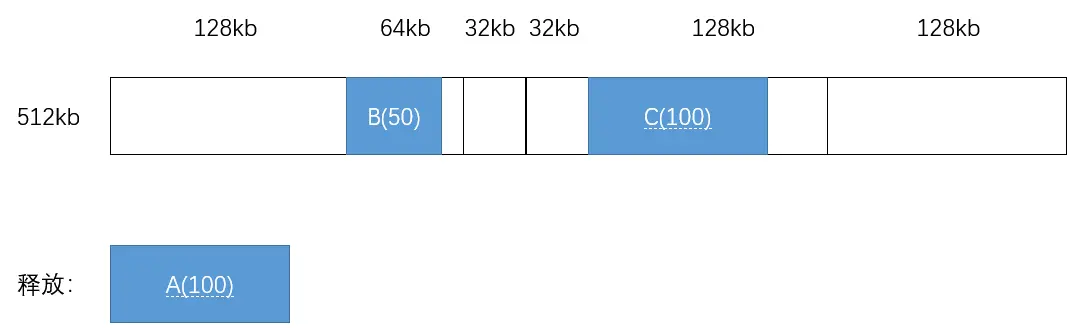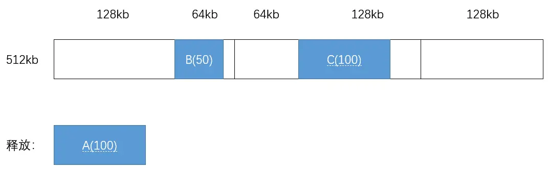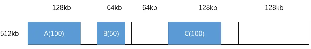 - 进程 A 请求 100kb,进程 B 请求 50kb,进程 C 请求 100kb