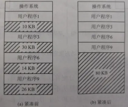 到目前为止,我们所讲的都是连续分配的方式,也就是说,为某个进程分配的必须是一块连续的空间 —— 若多个空闲分区不是相邻的,那么即便它们的大小相加后,已经足以满足进程的需求,也无济于事。为此,可以采用紧凑技术解决这个问题。紧凑技术可以把内存中各个进程进行移动,使得它们都相邻,从而把原先分开的各个空闲分区合并在一起,带来了更大的、可以充分利用的空闲分区: