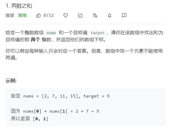 - 算法实现上,实例化HashMap,将数组中的元素、索引作为键值对存在HashMap中,在遍历数组元素时,巧妙调用containsKey()方法判断数组中是否包含结果元素(target - 当前元素),如果存在的话,通过HashMap的get()得到结果元素索引;