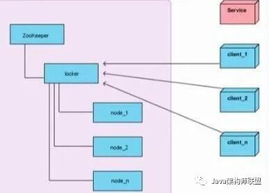 上图中左边是Zookeeper集群, lock是数据节点,node_1到node_n表示一系列的顺序临时节点,右侧client_1到client_n表示要获取锁的客户端。Service是互斥访问的服务。