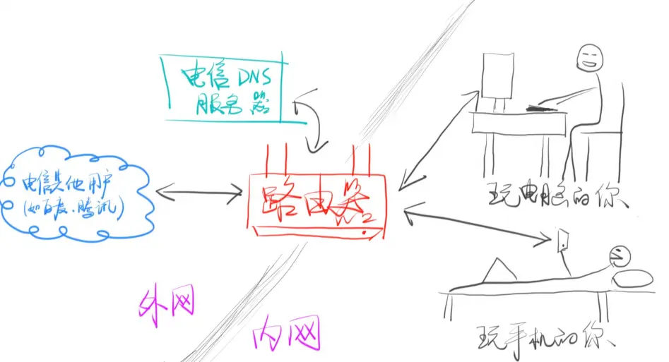 路由器会创建一个内网,内网连接下的设备使用的都是内网IP(手机、电脑)一般路由器ip为:198.168.1.1,其他内网设备IP地址以此类推。