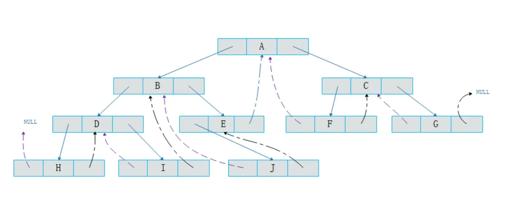 结点右⼦树为空,利⽤右孩⼦指针指向它的后继结点;