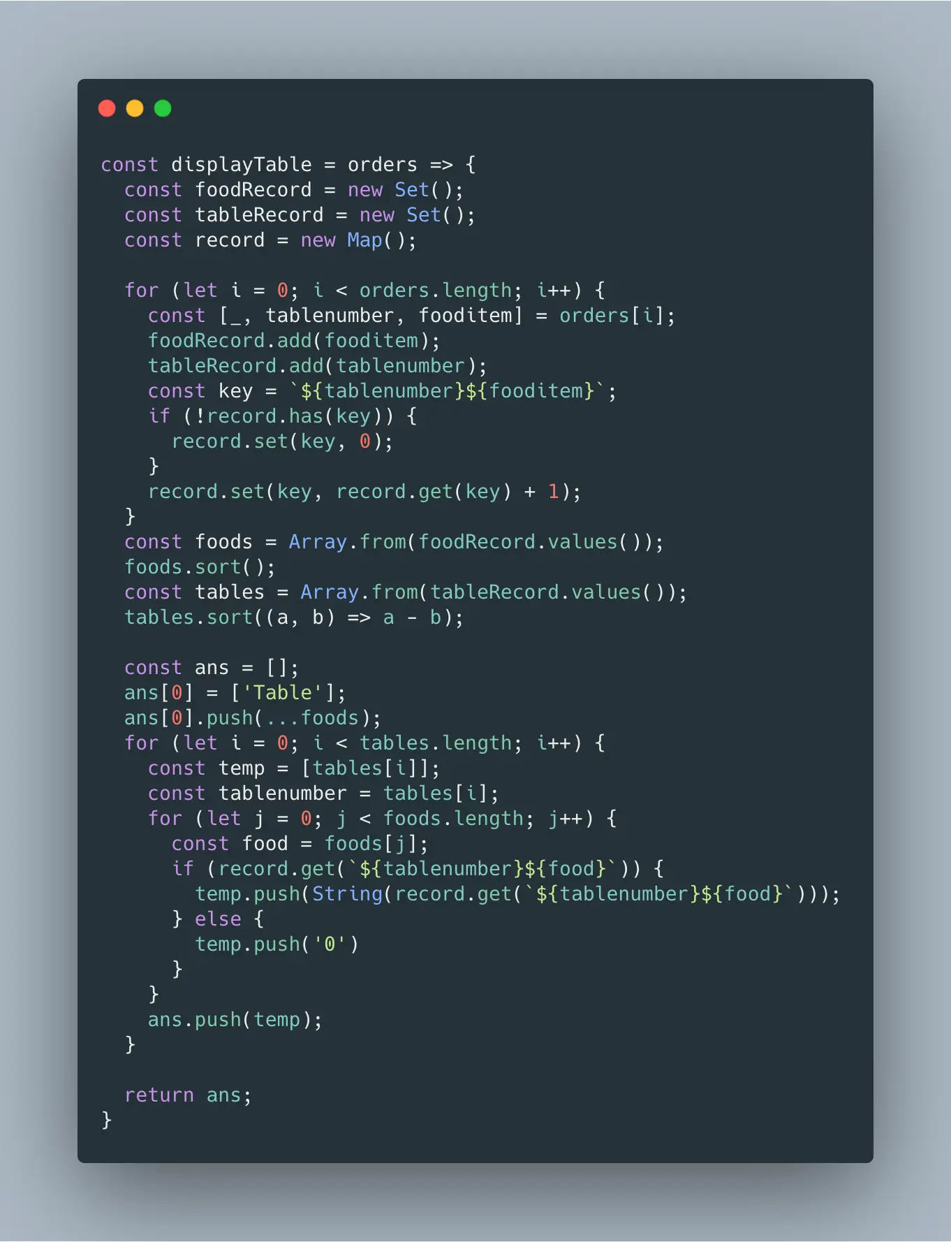给你一个数组 orders,表示客户在餐厅中完成的订单,确切地说, orders[i]=[customerNamei,tableNumberi,foodItemi] ,其中 customerNamei 是客户的姓名,tableNumberi 是客户所在餐桌的桌号,而 foodItemi 是客户点的餐品名称。 请你返回该餐厅的 点菜展示表 。在这张表中,表中第一行为标题,其第一列为餐桌桌号 “Table” ,后面每一列都是按字母顺序排列的餐品名称。接下来每一行中的项则表示每张餐桌订购的相应餐品数量,第一列应当填对应的桌号,后面依次填写下单的餐品数量。 注意:客户姓名不是点菜展示表的一部分。此外,表中的数据行应该按餐桌桌号升序排列。 示例: 输入:orders = [['David','3','Ceviche'],['Corina','10','Beef Burrito'],['David','3','Fried Chicken'],['Carla','5','Water'],['Carla','5','Ceviche'],['Rous','3','Ceviche']] 输出:[['Table','BeefBurrito','Ceviche','Fried Chicken','Water'],['3','0','2','1','0'],['5','0','1','0','1'],['10','1','0','0','0']] 解释: 点菜展示表如下所示: Table,Beef Burrito,Ceviche,Fried Chicken,Water 3 ,0 ,2 ,1 ,0 5 ,0 ,1 ,0 ,1 10 ,1 ,0 ,0 ,0 对于餐桌 3:David 点了 'Ceviche' 和 'Fried Chicken',而 Rous 点了 'Ceviche' 而餐桌 5:Carla 点了 'Water' 和 'Ceviche' 餐桌 10:Corina 点了 'Beef Burrito'