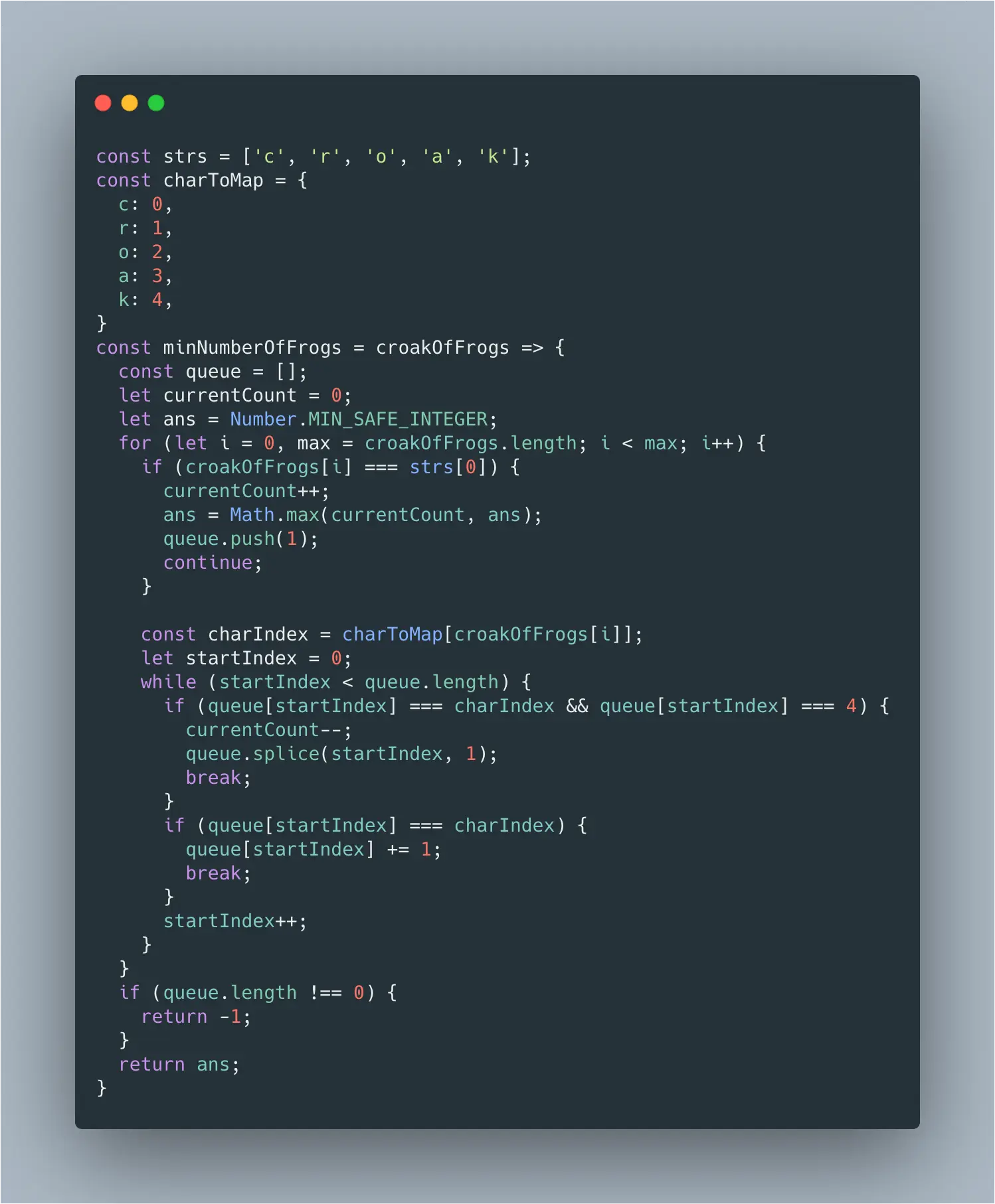 所以接下来的思路就是:利用队列来记录当前唱的字符状态,并且记录当前正在唱歌的青蛙数量。