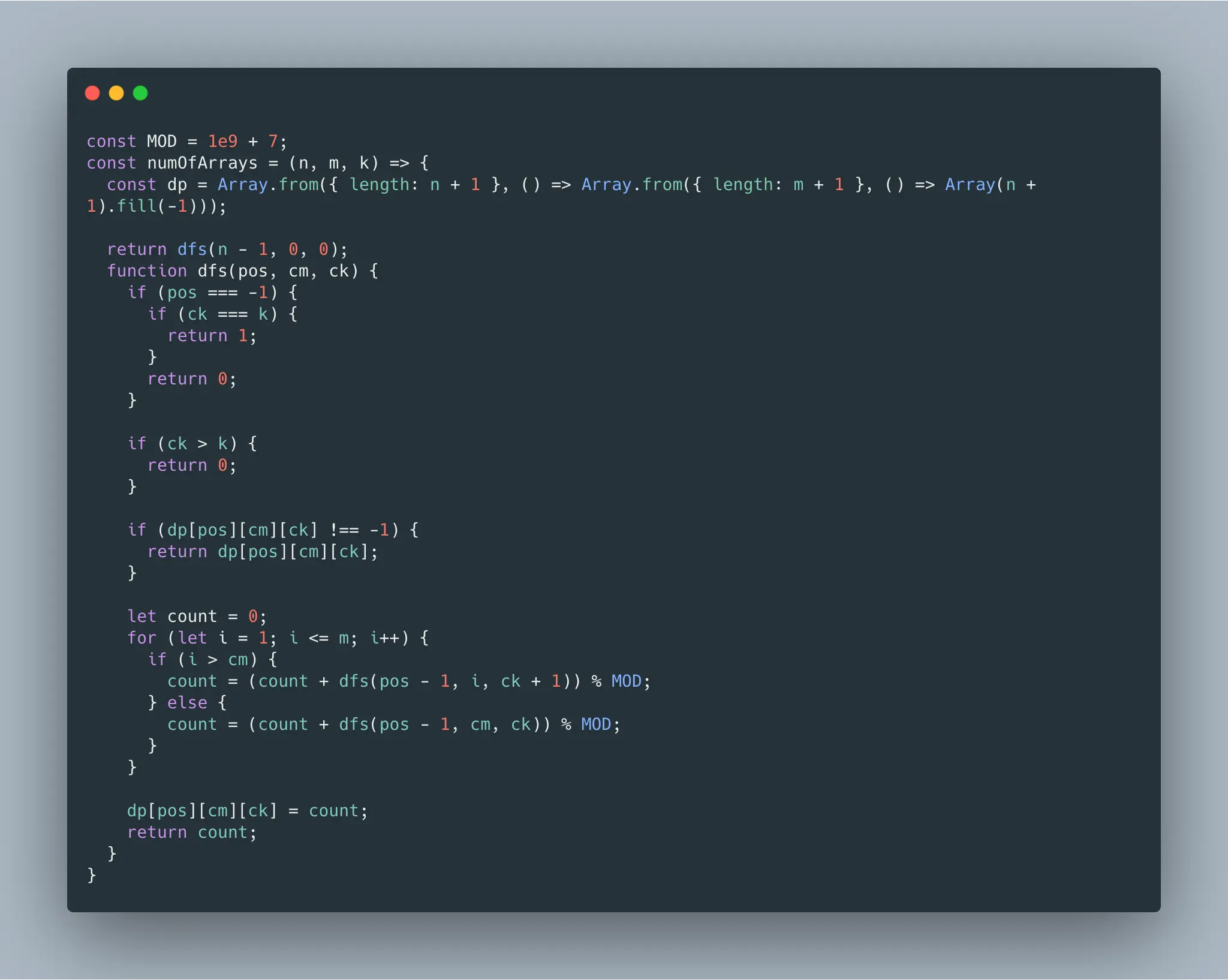 给你三个整数 n、m 和 k 。下图描述的算法用于找出正整数数组中最大的元素。 请你生成一个具有下述属性的数组 arr : arr 中有 n 个整数。 1 <= arr[i] <= m 其中 (0 <= i < n) 。 将上面提到的算法应用于 arr ,search_cost 的值等于 k 。 返回上述条件下生成数组 arr 的 方法数 ,由于答案可能会很大,所以 必须 对 10^9 + 7 取余。 示例: 输入:n = 2, m = 3, k = 1 输出:6 解释:可能的数组分别为 [1, 1], [2, 1], [2, 2], [3, 1], [3, 2] [3, 3]