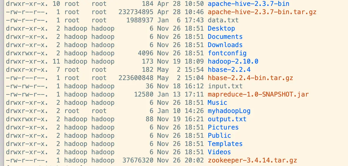 yum install ntpdate ntpdate ntp1.aliyun.com - hadoop2.10.0的tar.gz包上传至虚拟机 /home/hadoop目录下并进行解压(为方便期间,不设置单独用户,全部使用root用户做启动等操作)参考如下: