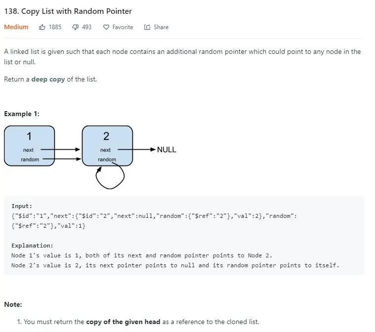 这道题其实和 133 题 复制一个图很类似,这里的话就是要解决的问题就是,当更新当前节点的 random 指针的时候,如果 random 指向的是很后边的节点,但此时后边的节点还没有生成,那么我们该如何处理。
