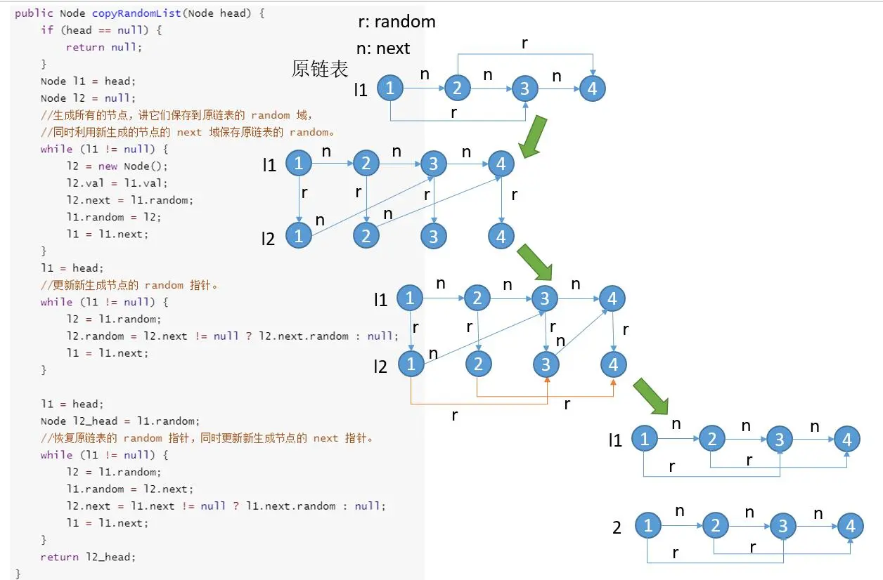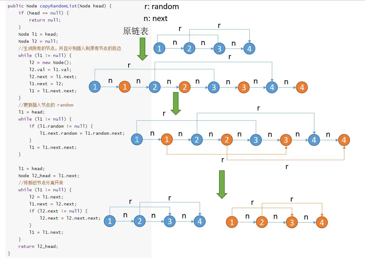 random域,同时利用新生成的节点的next域保存原链表的random。 - 更新新生成节点的