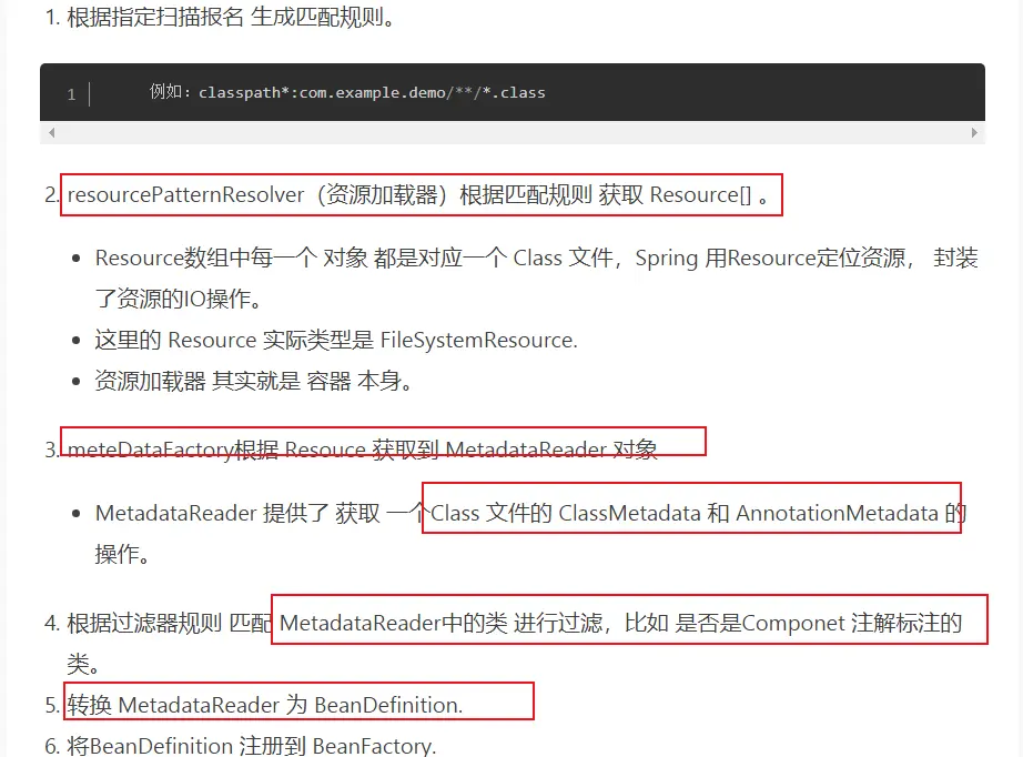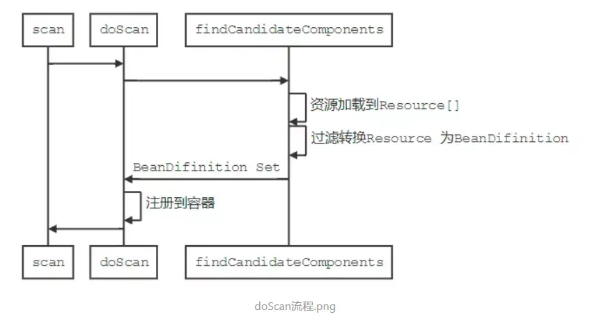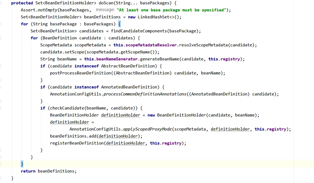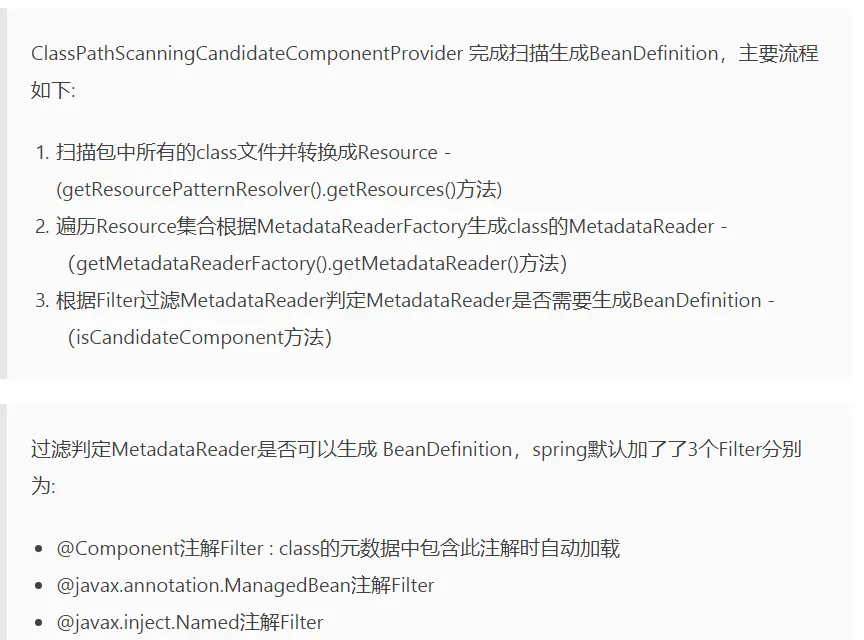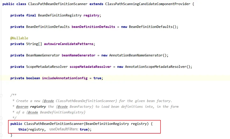 ClassPathBeanDefinitionScanner继承自ClassPathScanningCandidateComponentProvider,构造时要求指定一个BeanDefinitionRegistry对象,其扩展了一个scan方法,可以同时指定多个要扫描的包。底层在扫描bean定义时还是使用的父类的findCandidateComponents方法,但是扫描后会自动利用持有的BeanDefinitionRegistry自动对bean定义进行注册