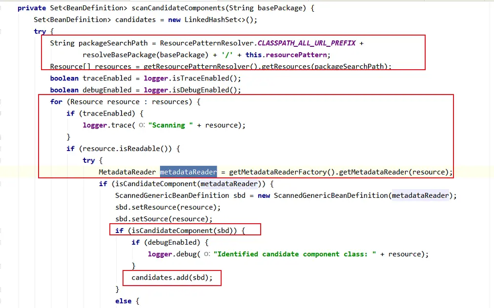 Set<BeanDefinition> candidates = new LinkedHashSet<BeanDefinition>();