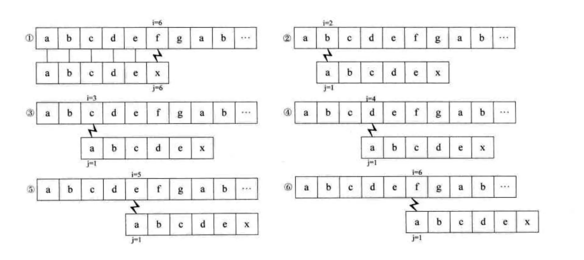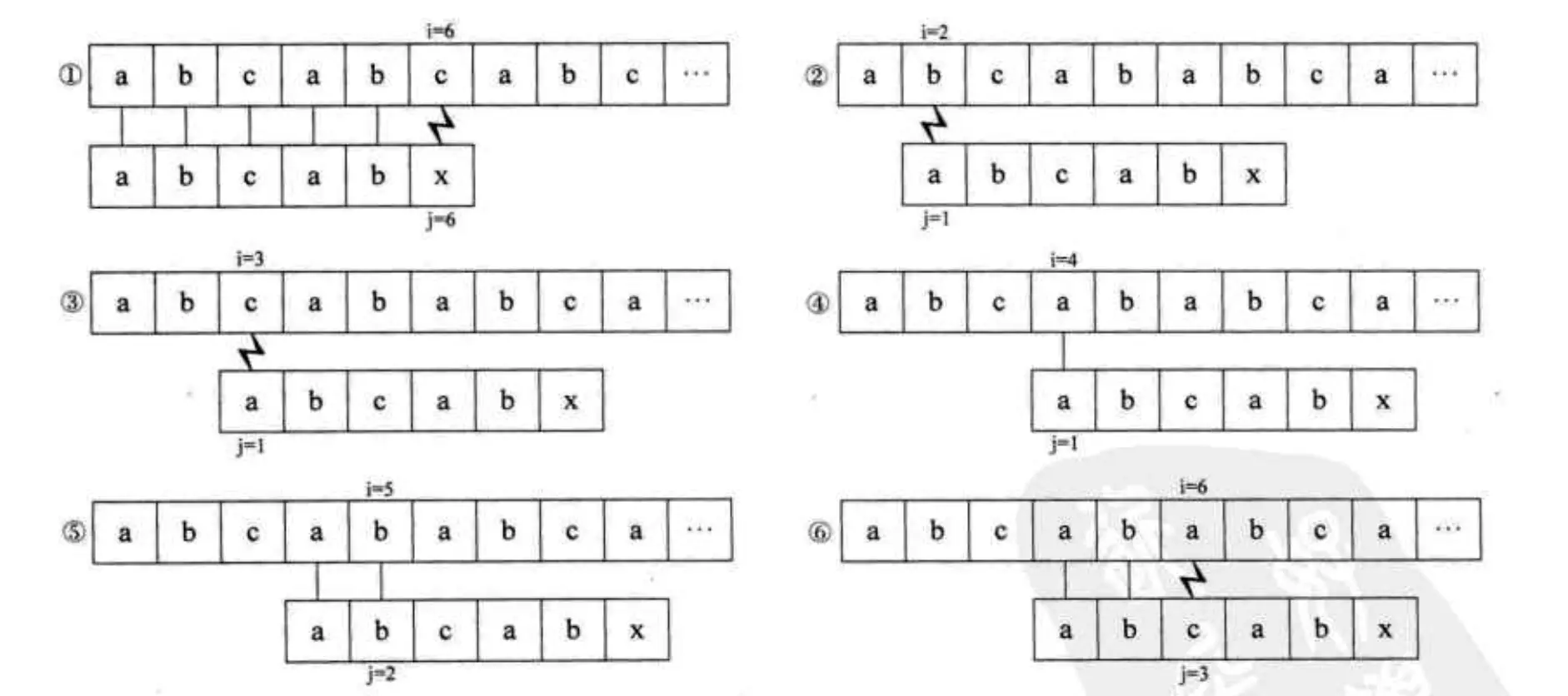 如果存在重复字符又会怎么样呢?我们再来看一个例子,主串为abcabcabc、模式串为abcabx。比较如下: