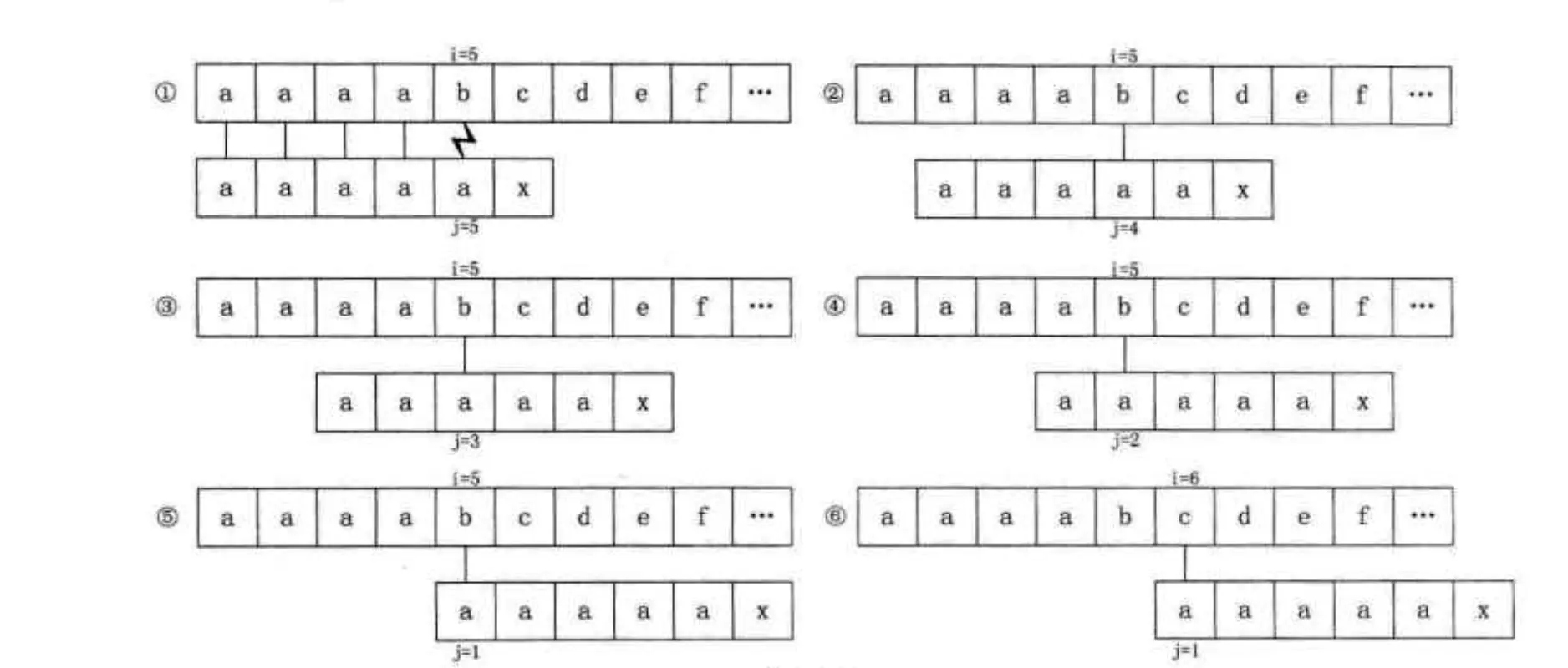 从代码可以看出,KMP算法的时间复杂度为O(m+n),相比于BF算法,还是有比较大的提高的。但是上述实现中还是有缺陷的,比如主串S= aaaabcde,模式串T= aaaaax,next数组是012345。匹配的过程如下: