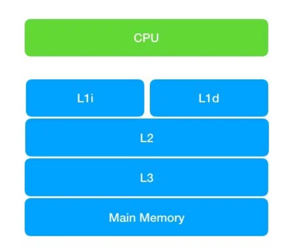 大家一定都知道摩尔定律。根据定律,CPU 每18个月速度将会翻一番。CPU 的计算速度提升了,但是内存的访问速度却没有什么大幅度的提升。瓶颈出现在对内存的访问上,没关系,我们可以使用缓存啊,这已经是路人皆知的手段了。CPU 更狠一点,用了 L1、L2、L3,一共三级缓存。其中 L1 缓存根据用途不同,还分为 L1i 和 L1d 两种缓存。如下图: