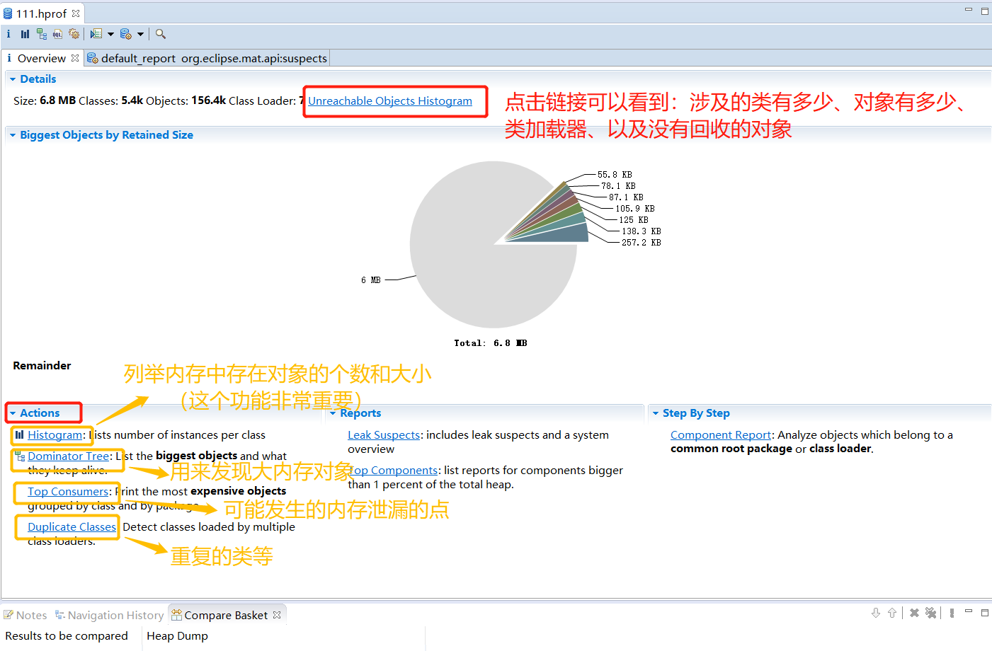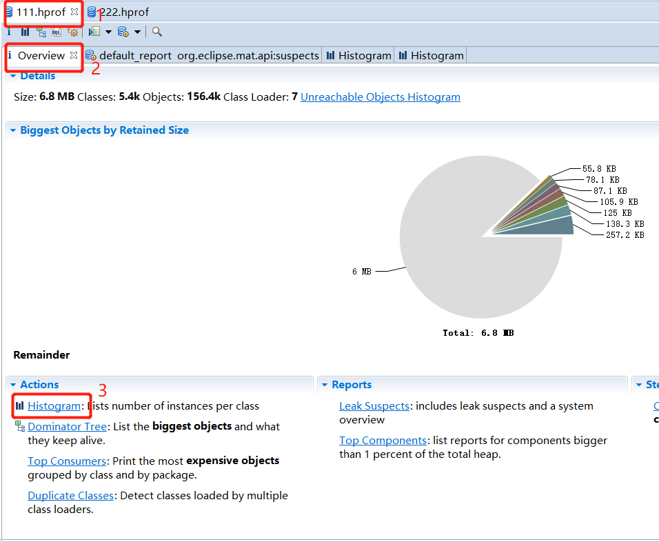 其中分析内存泄漏最常用的就是Histogram和Dominator Tree。Histogram视图是最重要的,其他三个视图也只是提供一些可能会造成内存泄漏的信息,点击Actions中给出的链接或者在MAT工具栏中就可以打开Dorminator Tree和Histogram,如下图所示: