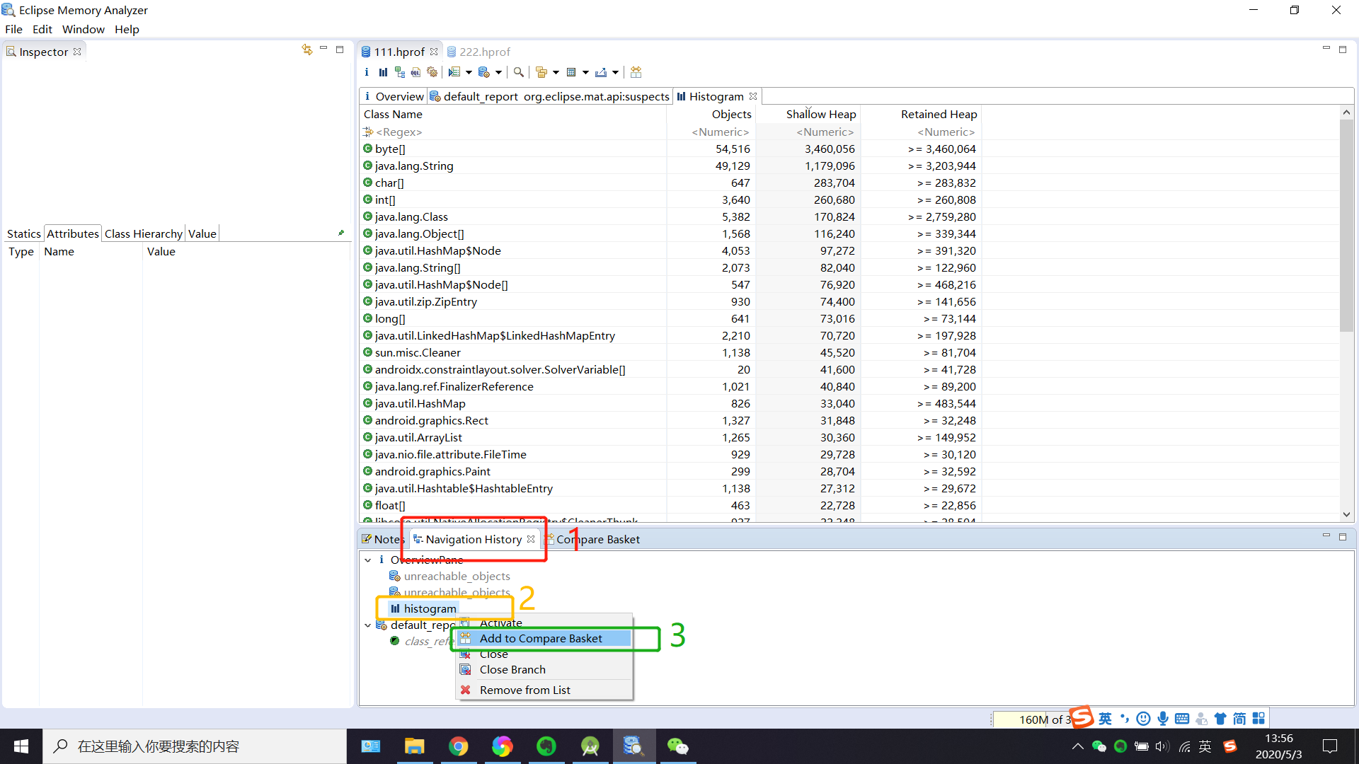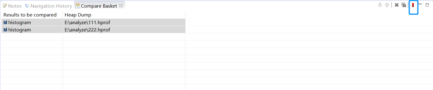 2、打开下面的面板Navigation History 选中histogram右键Add to Compare Basket添加到比较容器中,两个个hprof文件(111.hprof和222.hprof)都做以上同样的操作 将histogram 添加到比较容器中。