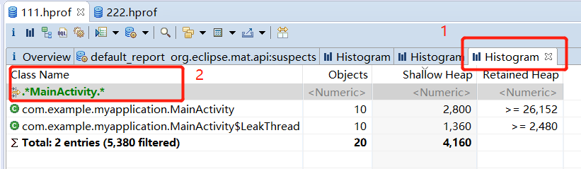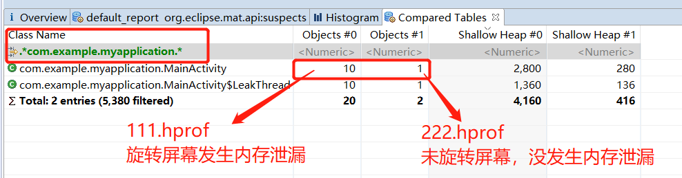 6、通上图就明显看出经过两个hprof比较,在我们操作了旋转多次屏幕后MainActivity的实例增加了,然后我们就去分析下111.hprof文件是导致MainActivity内存泄漏的原因